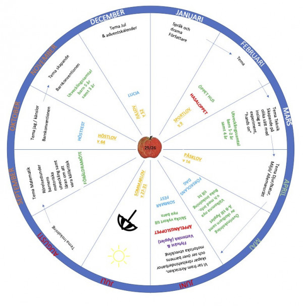Vi arbetar tematiskt på Äppelängen och båda avdelningarna arbetar med samma tema. Vi följer ett årshjul där vi pedagoger arbetat fram en grovplanering för läsåret. Nedan följer årshjul för läsår 25/26.